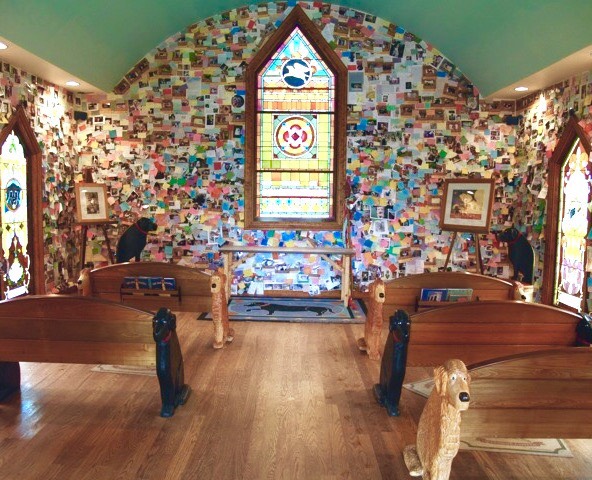A few months ago I came across a place in St. Johnsbury, Vermont that is actually a magnificent dog park situated on a small mountain, so the trails meander around it and lead to a pond where dogs can swim. They also have a gallery featuring many beautiful works, but the most interesting thing is the DOG CHAPEL where dog owners can memorialize their departed pets by sticking post-it notes to the walls, and also hold memorial services. Really nice idea. Unfortunately, the former owner/artist took his life after battling depression for many years. His wife tried to keep the place going, then took her life as well, but her brother is keeping their spirit alive by continuing operations with the former employees who remain very dedicated to the original mission of honoring DOGS. Anybody interested can read more at dogmt.com